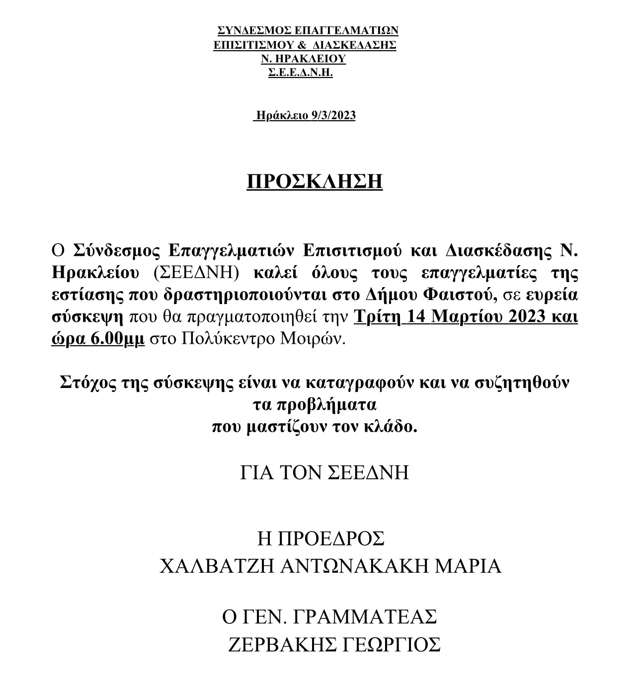 Ο Σύνδεσμος Επαγγελματιών Επισιτισμού και Διασκέδασης Ν. Ηρακλείου (ΣΕΕΔΝΗ) καλεί όλους τους επαγγελματίες της εστίασης που δραστηριοποιούνται στο Δήμου Φαιστού, σε ευρεία σύσκεψη που θα πραγματοποιηθεί την 2023 και ώρα 6.00μμ στο Πολύκεντρο Μοιρών.